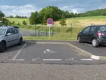 Ce pictogramme peut néanmoins être placé au milieu de l'emplacement de stationnement : ses dimensions sont dans ce cas de 1 m × 1.2 m.