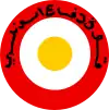 Cocarde en trois cercles : centre jaune sable, milieu blanc, supérieur rouge avec sur la moitié haute des inscriptions en arabe.