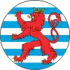 Cocarde reprenant le drapeau national: en 3 bandes verticales: haut et bas en rouge, centre en bleu avec un disque blanc.