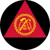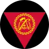 Image 1: Cocarde: noire avec un triangle rouge, au centre une houe jaune, tête vers la gauche, et un AK-47 jaune, canon vers la droite, croisés sur le relief jaune d'un livre ouvert, une petite étoile jaune sous la baïonnette. Image 2: Idem Image 1 sauf que le triangle a le sommet vers le bas.