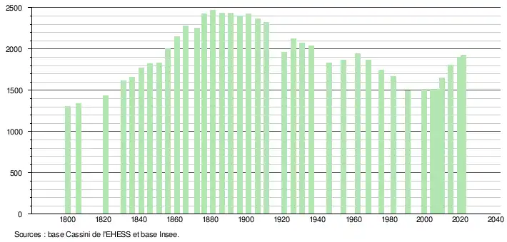 L'évolution du nombre d'habitants est connue à travers les recensements de la population effectués dans la commune depuis 1800. Pour les communes de moins de 10 000 habitants, une enquête de recensement portant sur toute la population est réalisée tous les cinq ans, les populations légales des années intermédiaires étant quant à elles estimées par interpolation ou extrapolation[20]. Pour la commune, le premier recensement exhaustif entrant dans le cadre du nouveau dispositif a été réalisé en 2004[21].