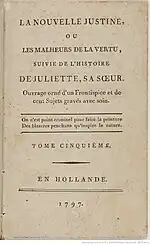 Une première version, Les Infortunes de la vertu, est rédigée à la Bastille en 1787, un conte philosophique au ton voltairien. Par étapes successives, l’auteur ajoute de nouveaux épisodes scabreux qu’il fait se succéder les uns aux autres, comme un feuilleton.