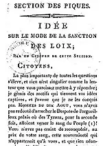 En 1792, « Louis Sade, homme de lettres » est nommé secrétaire, puis en juillet 1793, président de la section des piques[45]. Le , il prononce le Discours aux mânes de Marat et de Le Peletier lors de la cérémonie organisée en hommage aux deux « martyrs de la liberté ». Entraîné par le succès de ses harangues et de ses pétitions, emporté par sa ferveur athée, il prend des positions extrêmes en matière de déchristianisation au moment où le mouvement va être désavoué par Robespierre et les sans-culottes les plus radicaux éliminés de la scène (les Hébertistes vont être exécutés le 24 mars).