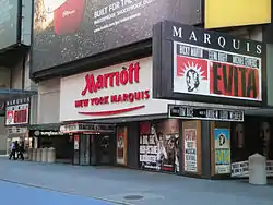Le Marquis Theatre a ouvert le , avec une série de concerts de Shirley Bassey. Le lieu de 1 611 places a été conçu par l'architecte John Portman. Parce que la construction de l'hôtel a impliqué la démolition de cinq théâtres (le Helen Hayes Theatre, le Morosco Theatre, le Bijou Theatre et les vestiges de l'Astor Theatre et de la Gaiety) Les responsables de la ville de New York ont autorisé Portman à construire la nouvelle propriété uniquement s'il acceptait d'inclure un théâtre dans la structure. Il est actuellement l'un des neuf exploités par la Nederlander Organisation.