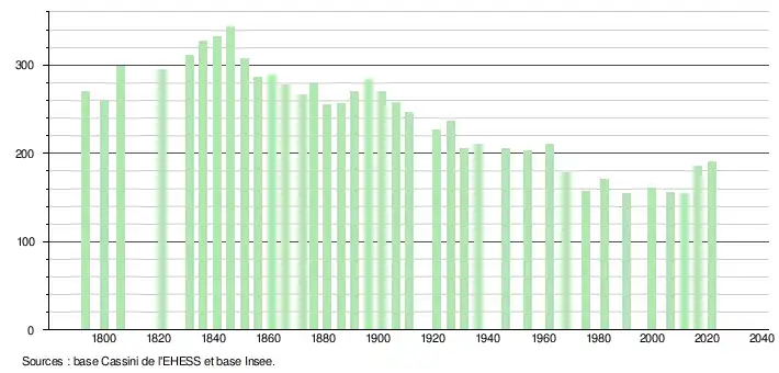 L'évolution du nombre d'habitants est connue à travers les recensements de la population effectués dans la commune depuis 1793. Pour les communes de moins de 10 000 habitants, une enquête de recensement portant sur toute la population est réalisée tous les cinq ans, les populations légales des années intermédiaires étant quant à elles estimées par interpolation ou extrapolation[17]. Pour la commune, le premier recensement exhaustif entrant dans le cadre du nouveau dispositif a été réalisé en 2006[18].