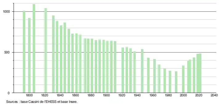 L'évolution du nombre d'habitants est connue à travers les recensements de la population effectués dans la commune depuis 1793. Pour les communes de moins de 10 000 habitants, une enquête de recensement portant sur toute la population est réalisée tous les cinq ans, les populations légales des années intermédiaires étant quant à elles estimées par interpolation ou extrapolation[25]. Pour la commune, le premier recensement exhaustif entrant dans le cadre du nouveau dispositif a été réalisé en 2008[26].