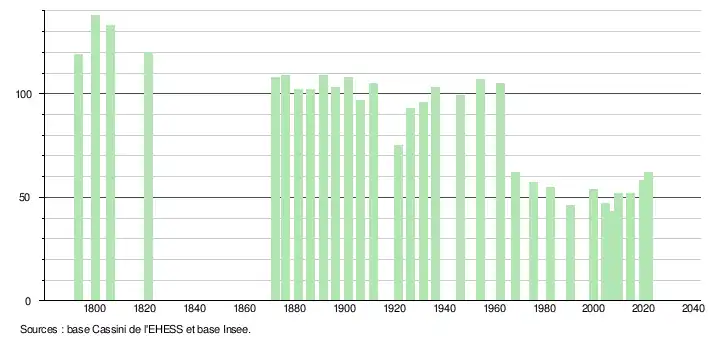L'évolution du nombre d'habitants est connue à travers les recensements de la population effectués dans la commune depuis 1793. Pour les communes de moins de 10 000 habitants, une enquête de recensement portant sur toute la population est réalisée tous les cinq ans, les populations légales des années intermédiaires étant quant à elles estimées par interpolation ou extrapolation[26]. Pour la commune, le premier recensement exhaustif entrant dans le cadre du nouveau dispositif a été réalisé en 2004[27].
