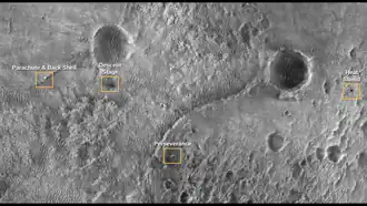 Le parachute d'un diamètre de 21,5 m est, à un facteur d'échelle près, un héritage du parachute développé pour le programme Viking. Ses caractéristiques générales sont proches de celui de Mars Science Laboratory mais il a été renforcé car Mars 2020 est plus lourd. Durant sa descente sous parachute qui dure entre 50 et 90 secondes, la vitesse de Mars 2020 est ramenée à 100 m/s (360 km/h) et environ 95 % de l'énergie cinétique qui subsistait avant son ouverture a été dissipée. Le bouclier thermique avant est éjecté dès que la vitesse tombe en dessous de Mach 0,8[Note 5], ce qui dégage l'antenne du radar Doppler de l'étage de descente qui peut alors fournir une première estimation de l'altitude et de la vitesse en utilisant les réflexions de ses émissions sur le sol martien. Durant cette phase, la sonde doit limiter la rotation de la capsule sous le parachute, un phénomène difficile à modéliser et dangereux qui découle des oscillations à vitesse supersonique ; les moteurs de contrôle d'orientation du bouclier arrière sont utilisés pour contrecarrer ces mouvements.
