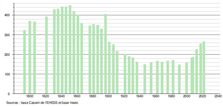| L'évolution du nombre d'habitants est connue à travers les recensements de la population effectués dans la commune depuis 1793. Pour les communes de moins de 10 000 habitants, une enquête de recensement portant sur toute la population est réalisée tous les cinq ans, les populations légales des années intermédiaires étant quant à elles estimées par interpolation ou extrapolation[25]. Pour la commune, le premier recensement exhaustif entrant dans le cadre du nouveau dispositif a été réalisé en 2007[26]. En 2021, la commune comptait 266 habitants[Note 5], en augmentation de 9,47 % par rapport à 2015 (Hautes-Pyrénées : +1,04 %, France hors Mayotte : +1,84 %). |