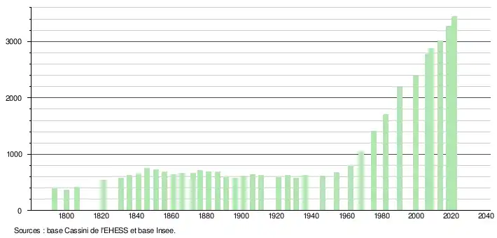 L'évolution du nombre d'habitants est connue à travers les recensements de la population effectués dans la commune depuis 1793. Pour les communes de moins de 10 000 habitants, une enquête de recensement portant sur toute la population est réalisée tous les cinq ans, les populations légales des années intermédiaires étant quant à elles estimées par interpolation ou extrapolation[30]. Pour la commune, le premier recensement exhaustif entrant dans le cadre du nouveau dispositif a été réalisé en 2008[31].