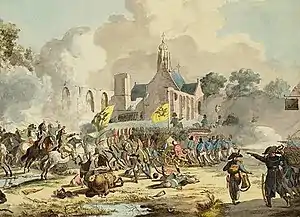 - « Le 3e jour complémentaire an VII, étant alors chef de brigade, il reçut ordre de s'opposer avec deux bataillons de la ½ brigade aux progrès de la colonne russe qui allait déboucher sur le village de Bergen (en Hollande-Septentrionale), il chargea à la tête de sa troupe avec une telle impétuosité qu'il renversa l'ennemi et le mit en déroute. 7 pièces de canon, 6 drapeaux, la colonne entière prisonnière de guerre, ainsi que le général Hermann et son état-major furent le fruit de ses sages dispositions. »