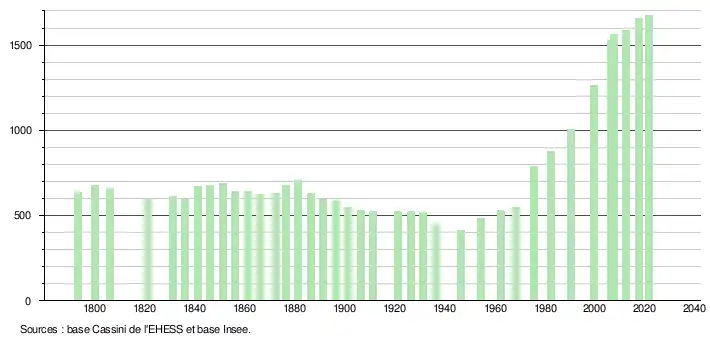 L'évolution du nombre d'habitants est connue à travers les recensements de la population effectués dans la commune depuis 1793. Pour les communes de moins de 10 000 habitants, une enquête de recensement portant sur toute la population est réalisée tous les cinq ans, les populations légales des années intermédiaires étant quant à elles estimées par interpolation ou extrapolation[18]. Pour la commune, le premier recensement exhaustif entrant dans le cadre du nouveau dispositif a été réalisé en 2007[19].
