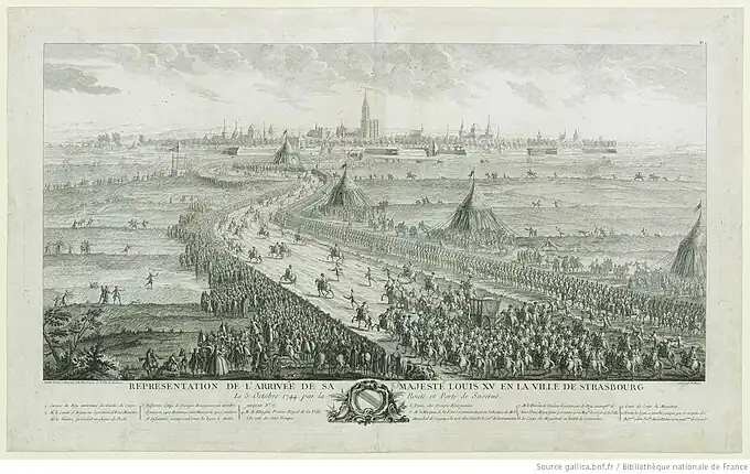 - British Museum, Londres, Représentation de l'arrivée de Sa Majesté Louis XV à Strasbourg le par la route et la porte de Salerne[17].
