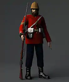 Guerre anglo-zouloue. Concomitante du désastre d'Isandhlwana, la résistance victorieuse de 150 red-coats face à des milliers de Zoulous lors de la bataille de Rorke's Drift fut illustrée par l'imagerie populaire et conforta le moral de nombreux Britanniques. On voit à droite un troupier, tête-nue, face à l'ennemi, tendant la main pour recevoir la cartouche que lui passe un de ses amis blessés : il va pouvoir charger la chambre vide de son fusil Martini-Henry, qui a le levier d'armement baissé; la plupart des Martini-Henry ont la baïonnette au canon, et trois d'entre eux sont vigoureusement maniés de haut en bas du parapet. Au premier plan à droite, deux grosses sagaies (iklwas) lancées par les Zoulous.