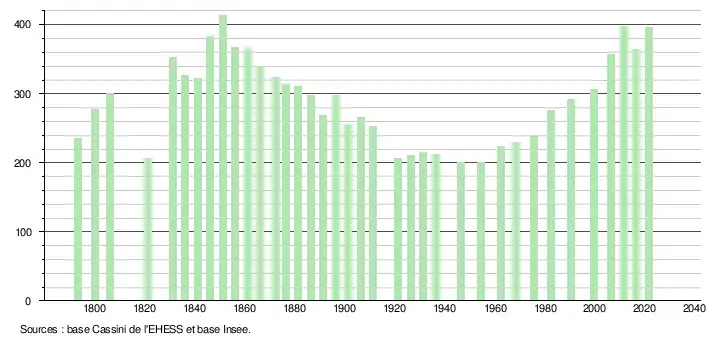 L'évolution du nombre d'habitants est connue à travers les recensements de la population effectués dans la commune depuis 1793. Pour les communes de moins de 10 000 habitants, une enquête de recensement portant sur toute la population est réalisée tous les cinq ans, les populations légales des années intermédiaires étant quant à elles estimées par interpolation ou extrapolation[32]. Pour la commune, le premier recensement exhaustif entrant dans le cadre du nouveau dispositif a été réalisé en 2006[33].