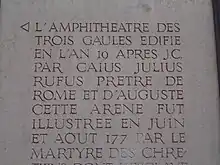 - L'amphithéâtre des Trois Gaules où a eu lieu le supplice ; il est redécouvert par fouilles successives en 1818-1820, puis en plusieurs campagnes de 1956 à 1978. Un poteau en bois au centre de l'arène y commémore les martyrs de 177. Jean-Paul II s'y est recueilli lors de sa visite à Lyon en 1986.