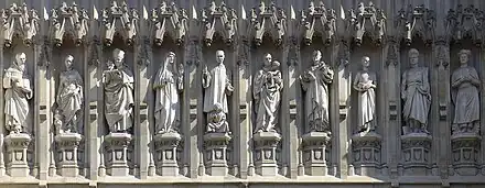 Sculptées dans un style figuratif, ces dix statues occupent des niches restées vides depuis le Moyen Âge. Le matériau utilisé est le calcaire de Richemont (Charente). Elles sont l'œuvre de quatre sculpteurs, dont Andrew Tanser pour la statue de Maximilien Kolbe[2] et Tim Crawley pour celle de Dietrich Bonhoeffer.