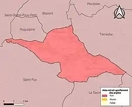 Le retrait-gonflement des sols argileux est susceptible d'engendrer des dommages importants aux bâtiments en cas d’alternance de périodes de sécheresse et de pluie. La totalité de la commune est en aléa moyen ou fort (94,5 % au niveau départemental et 48,5 % au niveau national). Sur les 98 bâtiments dénombrés sur la commune en 2019, 98 sont en aléa moyen ou fort, soit 100 %, à comparer aux 93 % au niveau départemental et 54 % au niveau national. Une cartographie de l'exposition du territoire national au retrait gonflement des sols argileux est disponible sur le site du BRGM[20],[Carte 3].