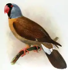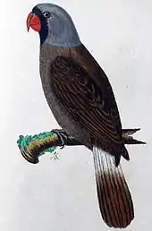 On trouve le mascarin à l'île de Bourbon ; j'en ai vu plusieurs vivants à Paris ; c'étaient des oiseaux assez doux ; ils n'avaient en leur faveur que leur bec rouge qui tranchait agréablement sur le fond sombre de leur plumage ; ils n'avaient pas appris à parler[26].