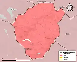 Le retrait-gonflement des sols argileux est susceptible d'engendrer des dommages importants aux bâtiments en cas d’alternance de périodes de sécheresse et de pluie. 99,4 % de la superficie communale est en aléa moyen ou fort (88,8 % au niveau départemental et 48,5 % au niveau national). Sur les 78 bâtiments dénombrés sur la commune en 2019, 78 sont en aléa moyen ou fort, soit 100 %, à comparer aux 98 % au niveau départemental et 54 % au niveau national. Une cartographie de l'exposition du territoire national au retrait gonflement des sols argileux est disponible sur le site du BRGM[23],[Carte 1].