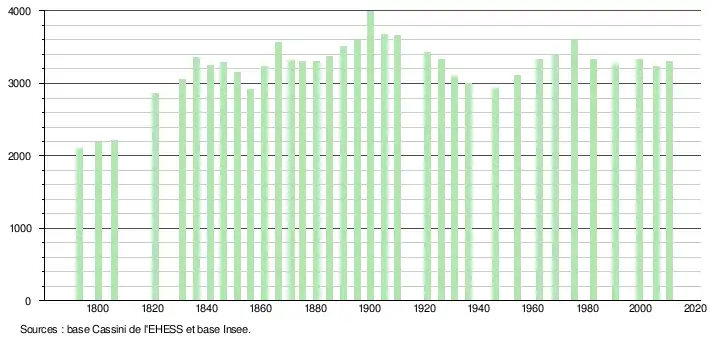 - Par convention dans Wikipédia, le principe a été retenu de n’afficher dans le tableau des recensements et le graphique, pour les populations légales postérieures à 1999, que les populations correspondant à une enquête exhaustive de recensement pour les communes de moins de 10 000 habitants, et que les populations des années 2006, 2011, 2016, etc. pour les communes de plus de 10 000 habitants, ainsi que la dernière population légale publiée par l’Insee pour l'ensemble des communes.