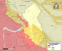 Le retrait-gonflement des sols argileux est susceptible d'engendrer des dommages importants aux bâtiments en cas d’alternance de périodes de sécheresse et de pluie[31]. 59,1 % de la superficie communale est en aléa moyen ou fort (59 % au niveau départemental et 48,5 % au niveau national)[Carte 5]. Depuis le , en application de la loi ELAN, différentes contraintes s'imposent aux vendeurs, maîtres d'ouvrages ou constructeurs de biens situés dans une zone classée en aléa moyen ou fort[Note 9],[32].