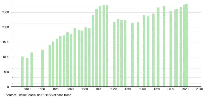 L'évolution du nombre d'habitants est connue à travers les recensements de la population effectués dans la commune depuis 1793. Pour les communes de moins de 10 000 habitants, une enquête de recensement portant sur toute la population est réalisée tous les cinq ans, les populations légales des années intermédiaires étant quant à elles estimées par interpolation ou extrapolation[43]. Pour la commune, le premier recensement exhaustif entrant dans le cadre du nouveau dispositif a été réalisé en 2008[44].