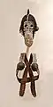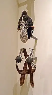 Le masque, ornementé de cauris ainsi que son extension au niveau du torse formant une poitrine féminine, représente une femme peule.