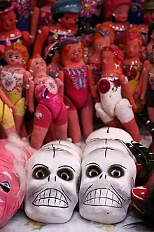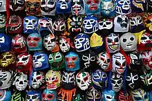 Aujourd'hui, la plupart des masques sont utilisés pour des célébrations et des rituels, bien que des images modernes et de nouvelles variations soient entrées dans la culture populaire moderne. Les masques traditionnels sont sculptés avec des images de personnages tels que Pedro Infante et Cantinflas[20]. L’influence d’Halloween aux États-Unis entraîne l’apparition de masques fabriqués commercialement pour les moments autour du Jour des morts[21]. Des personnages masqués apparaissent dans les bandes dessinées, la télévision et des films tels que Chapulín Colorado et Karmatron (en). Cependant, les masques les plus utilisés dans la culture populaire mexicaine sont ceux associés à la lucha libre ou à la lutte professionnelle[22]. Ici, le masque est un symbole de l'identité professionnelle du lutteur. Ils sont faits de tissu et enveloppent la tête ainsi que le visage avec des renforts en plastique autour des yeux et de la bouche. Les dessins sont propres au lutteur et ils se battent pour défendre cette identité. Un certain nombre de ces masques sont transmis de père en fils, tels que ceux d' El Santo, de Blue Demon, de Los Hermanos Dinamita (en), de Tinieblas (en) et de Dos Caras (en). Dans le cas d'un combat appelé « lucha de apuestos », le perdant perd son masque et son vrai visage est révélé. Après cela, le masque ne pourra plus jamais être utilisé[23].