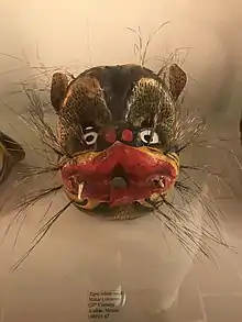 Un animal plus important est le jaguar ou ocelot, souvent qualifié à tort de « tigre » dans les différentes danses qui le caractérisent. Ce personnage apparaît dans Morelos, Puebla, Guerrero, Oaxaca, Chiapas et Tabasco dans des danses telles que Tecuanes, Tlacololeros, Tejonrones, El Calalá ou El Pochó. Le comportement de ce personnage de tigre varie du combat à la poursuite des chasseurs, mais le symbolisme est le plus souvent lié au cycle agricole et à la saison des pluies dont il dépend[11],[54],[55]. Les masques de tigre vont de petit à la taille du visage humain, avec des visages beaucoup plus grands, les danseurs regardant par les mâchoires[52]. Le masque peut ne couvrir que le visage ou être un casque en cuir ou en tissu et compléter un costume[56].