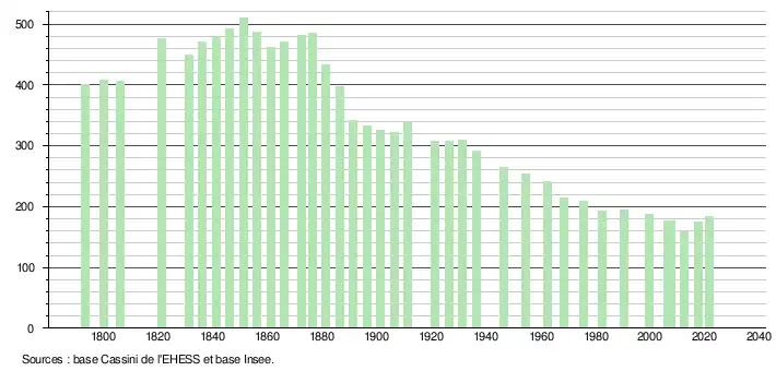 L'évolution du nombre d'habitants est connue à travers les recensements de la population effectués dans la commune depuis 1793. Pour les communes de moins de 10 000 habitants, une enquête de recensement portant sur toute la population est réalisée tous les cinq ans, les populations légales des années intermédiaires étant quant à elles estimées par interpolation ou extrapolation[15]. Pour la commune, le premier recensement exhaustif entrant dans le cadre du nouveau dispositif a été réalisé en 2007[16].