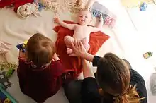 - une source régulière d'Interaction adulte-enfant ou parent-enfant, et une forme particulière de communication non verbale passant par le contact corporel/visuel/vocal/d'écoute. Il semble pouvoir stimuler l'attention du bébé ou du jeune enfant sur son corps et sur ce qui se passe autour de lui ;
