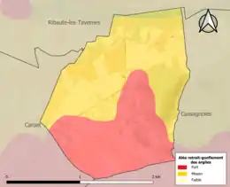 La commune est vulnérable au risque de mouvements de terrains constitué principalement du retrait-gonflement des sols argileux[16]. Cet aléa est susceptible d'engendrer des dommages importants aux bâtiments en cas d’alternance de périodes de sécheresse et de pluie. La totalité de la commune est en aléa moyen ou fort (67,5 % au niveau départemental et 48,5 % au niveau national). Sur les 88 bâtiments dénombrés sur la commune en 2019, 88 sont en aléa moyen ou fort, soit 100 %, à comparer aux 90 % au niveau départemental et 54 % au niveau national. Une cartographie de l'exposition du territoire national au retrait gonflement des sols argileux est disponible sur le site du BRGM[17],[Carte 2].