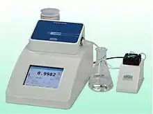 Une autre possibilité pour déterminer les densités de liquides et de gaz est d'utiliser un instrument numérique basé sur le principe du tube en U oscillant, le densimètre électronique dont la fréquence résultante est proportionnelle à la masse volumique du produit injecté[5].