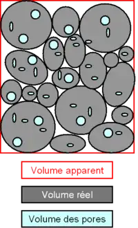 La masse volumique apparente est le rapport entre la masse des particules et le volume apparent qui comprend le volume du solide, celui des pores et le volume de l'espace entre les grains[7]. Les valeurs données dans les tableaux de cet article sont définies par cette masse volumique qui est la plus couramment utilisée pour les matériaux de manière générale.
