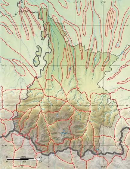| Localisation des massifs de Cauterets et adjacents dans les Hautes-Pyrénées[1],[2],[3]. | ||||||||||||||||||||||||