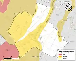 Les mouvements de terrains susceptibles de se produire sur la commune sont des tassements différentiels[17]. Le retrait-gonflement des sols argileux est susceptible d'engendrer des dommages importants aux bâtiments en cas d’alternance de périodes de sécheresse et de pluie[18]. 52,8 % de la superficie communale est en aléa moyen ou fort (79,5 % au niveau départemental et 48,5 % au niveau national)[Carte 2]. Depuis le , en application de la loi ÉLAN, différentes contraintes s'imposent aux vendeurs, maîtres d'ouvrages ou constructeurs de biens situés dans une zone classée en aléa moyen ou fort[Note 3],[19].