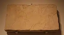 Ce bloc en relief appartenait à la plus haute des trois bandes d'images du soffite de passage droit entre deux pièces. Il représente la reliure et l'abattage d'un bœuf. Un homme tient le bœuf par les cornes tandis qu'un deuxième tire les pattes avant de dessous avec une corde et donne un coup de pied à la patte arrière avec son pied pour faire tomber l'animal. L'inscription indique qu'il s'agit d'une jeune offrande au propriétaire de la tombe.