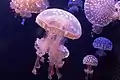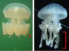 - Mastigias papua etpisoni Isolées depuis 15000 ans dans des lacs d'eau saumâtre de Palau dont le lac aux Méduses.