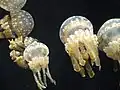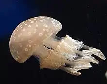 La Mastigias papua a des points sur l'ombrelle et des tentacules sous ses bras oraux.
