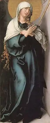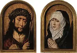 Cette mise en avant de la souffrance de Marie au moment de la Crucifixion s'amplifie au cours des siècles avec un réalisme croissant dans le contexte des guerres et des pestes aux XIVe et XVe siècles[16] dans des topos comme le Stabat Mater représentant Marie au pied de la croix (on trouve aussi les titres de Crucifixion, Golgotha, Calvaire...), la Pietà où la mère porte le corps du supplicié, mais aussi la Descente de la croix avec la déposition du Christ et la Mise au tombeau. Ces thèmes, concomitants avec les représentations terribles de danses macabres et du Jugement dernier, peuvent être traités conjointement, particulièrement dans les retables (comme le Retable d'Issenheim de Grunewald au début du XVIe siècle) ou séparément.