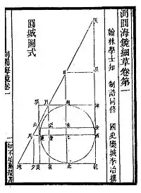 Le Cèyuán Hǎijìng (en) (測圓海鏡, Miroir de la mer mesurant le cercle), est une collection de 692 formules et 170 problèmes concernant l'inscription d'un cercle dans un triangle. Écrit par Li Ye en 1248, il utilise le tian yuan shu (en) (天元术, méthode de l'élément céleste) pour convertir des problèmes de géométrie en des questions purement algébriques ; il utilise ensuite le fan fa (variante de notre méthode de Horner) pour résoudre les équations obtenues (pouvant aller jusqu'au degré 6), mais le livre ne détaille pas cette méthode de résolution[33].