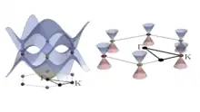 L'état semi-métallique correspond à un croisement linéaire de bandes d'énergie au et points de la zone de Brillouin hexagonale du graphène . En ces deux points, la structure électronique peut être effectivement décrite par l'hamiltonien