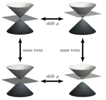 qui contient maintenant un terme de masse . Il existe plusieurs façons distinctes d'introduire un terme de masse, et les résultats ont des caractéristiques différentes[8],[9]. L'approche la plus pratique pour créer un écart (en introduisant un terme de masse) consiste à briser la symétrie sous-réseau du réseau où chaque atome de carbone est légèrement différent de son plus proche mais identique à ses voisins les plus proches; un effet qui peut résulter des effets du substrat.