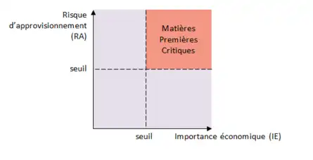 Les matières premières critiques sont définies en Europe comme étant « celles qui présentent un risque particulièrement élevé de pénurie d’approvisionnement dans les dix prochaines années et qui jouent un rôle particulièrement important dans la chaîne de valeur[2] », en d’autres termes elles sont à la fois caractérisées par un risque d’approvisionnement et une importance économique élevés.