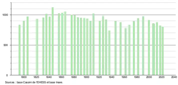 L'évolution du nombre d'habitants est connue à travers les recensements de la population effectués dans la commune depuis 1793. Pour les communes de moins de 10 000 habitants, une enquête de recensement portant sur toute la population est réalisée tous les cinq ans, les populations légales des années intermédiaires étant quant à elles estimées par interpolation ou extrapolation[22]. Pour la commune, le premier recensement exhaustif entrant dans le cadre du nouveau dispositif a été réalisé en 2007[23].