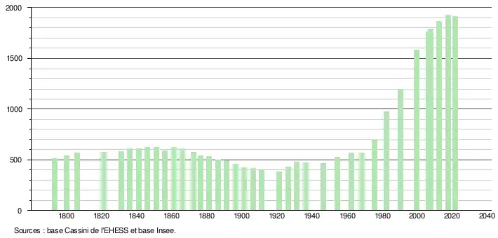 L'évolution du nombre d'habitants est connue à travers les recensements de la population effectués dans la commune depuis 1793. Pour les communes de moins de 10 000 habitants, une enquête de recensement portant sur toute la population est réalisée tous les cinq ans, les populations légales des années intermédiaires étant quant à elles estimées par interpolation ou extrapolation[23]. Pour la commune, le premier recensement exhaustif entrant dans le cadre du nouveau dispositif a été réalisé en 2007[24].
