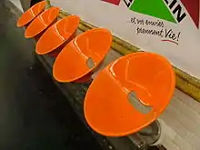 La station se distingue toutefois par la présence en son centre de deux tubes parallèles de lumières jaune orangé clignotantes, lesquels suivent la courbure de la voûte, le long du couloir passant au-dessus des voies. La scénographie a été confiée à Bernard Baissait et son agence de graphisme[8],[9].