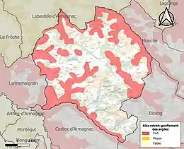 Le retrait-gonflement des sols argileux est susceptible d'engendrer des dommages importants aux bâtiments en cas d’alternance de périodes de sécheresse et de pluie. 37,6 % de la superficie communale est en aléa moyen ou fort (94,5 % au niveau départemental et 48,5 % au niveau national). Sur les 193 bâtiments dénombrés sur la commune en 2019, 32 sont en aléa moyen ou fort, soit 17 %, à comparer aux 93 % au niveau départemental et 54 % au niveau national. Une cartographie de l'exposition du territoire national au retrait gonflement des sols argileux est disponible sur le site du BRGM[27],[Carte 3].