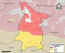 Le retrait-gonflement des sols argileux est susceptible d'engendrer des dommages importants aux bâtiments en cas d’alternance de périodes de sécheresse et de pluie. 92,2 % de la superficie communale est en aléa moyen ou fort (94,5 % au niveau départemental et 48,5 % au niveau national). Sur les 97 bâtiments dénombrés sur la commune en 2019, 88 sont en aléa moyen ou fort, soit 91 %, à comparer aux 93 % au niveau départemental et 54 % au niveau national. Une cartographie de l'exposition du territoire national au retrait gonflement des sols argileux est disponible sur le site du BRGM[21],[Carte 3].